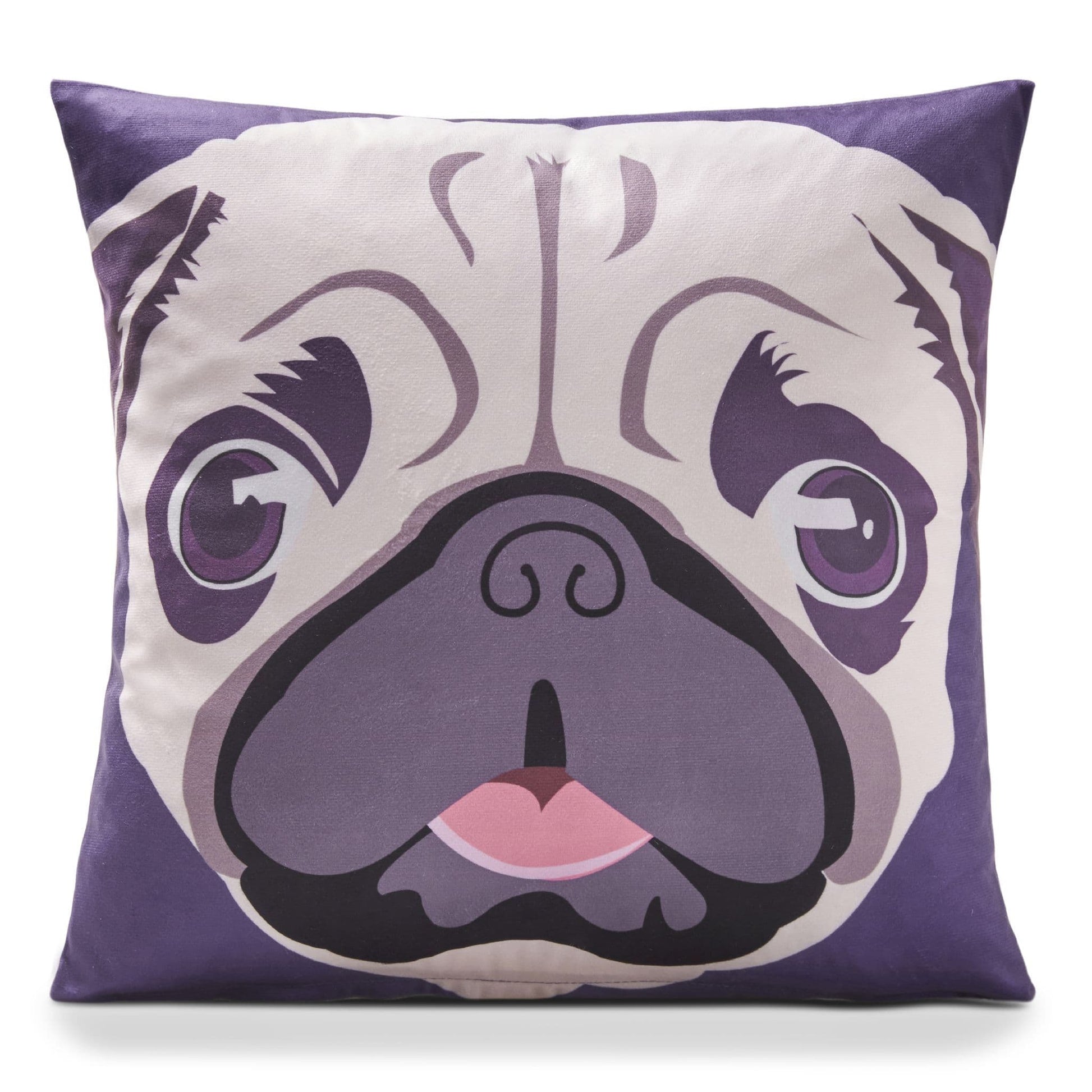 The Alan Symonds Breeds Pug filled cushion features a printed design of a pug dog in a soft velvet fabric.