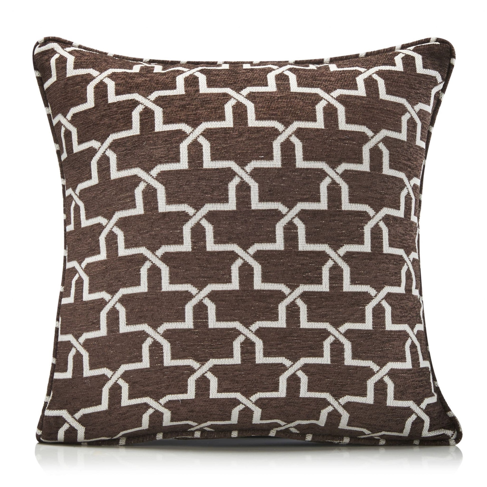 The Alan Symonds Petra filled cushion in Chocolate features a stylish geometric design in a woven chenille fabric, available in 2 size options.