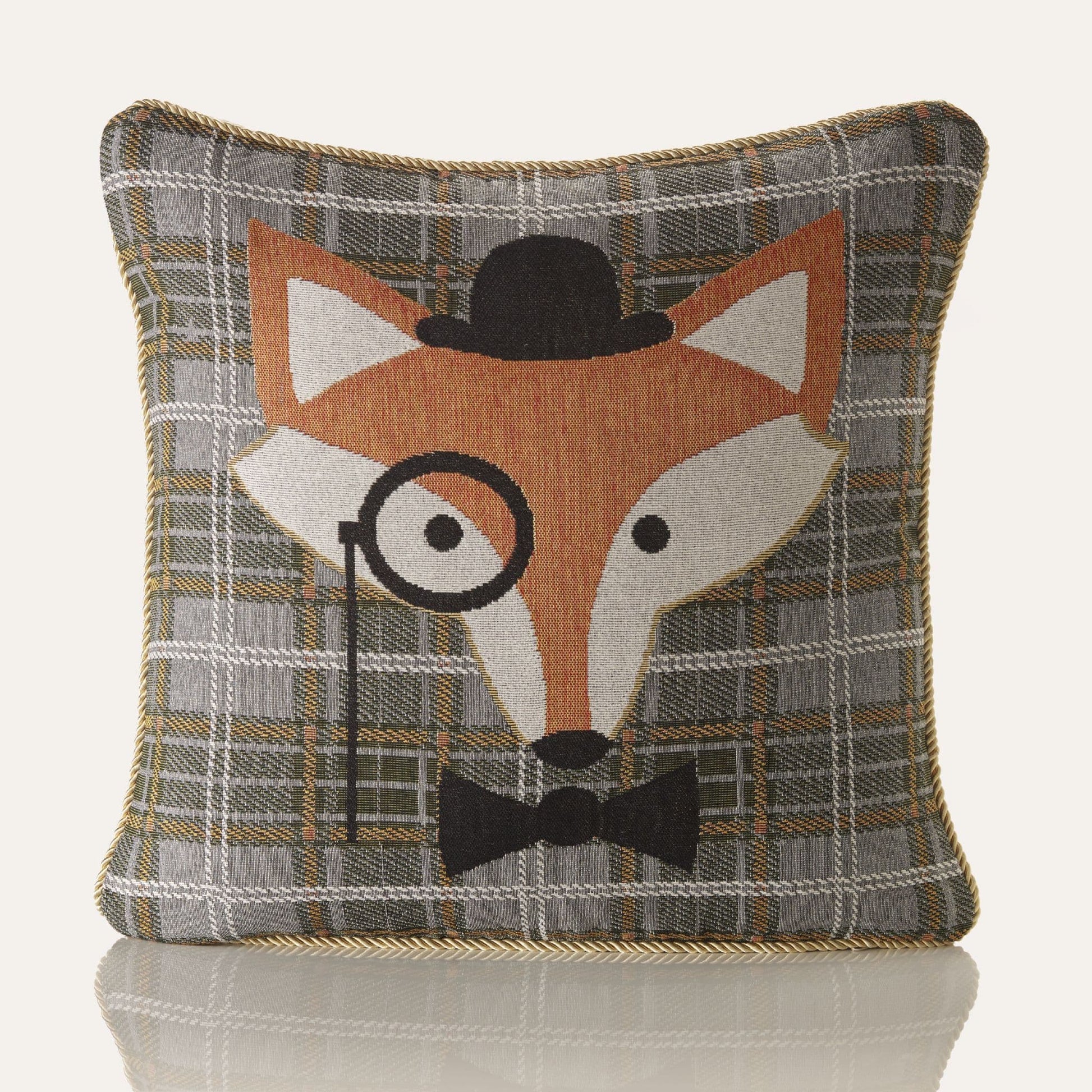 The Alan Symonds Tapestry Mr Fox filled cushion features a fox design in a rich and heavy chenille fabric with rope piping and a velvet reverse.