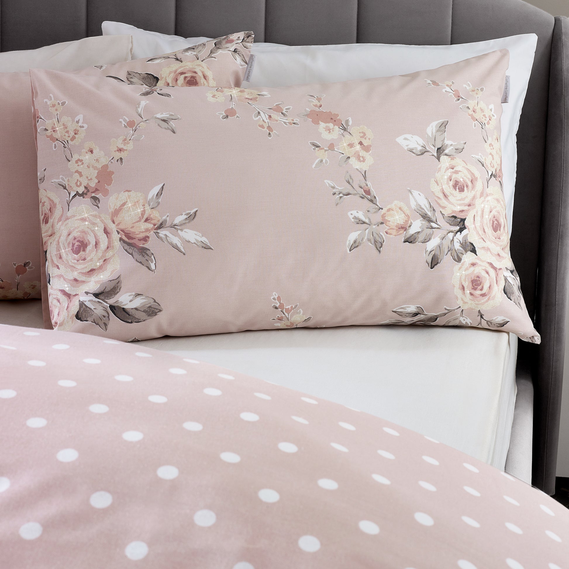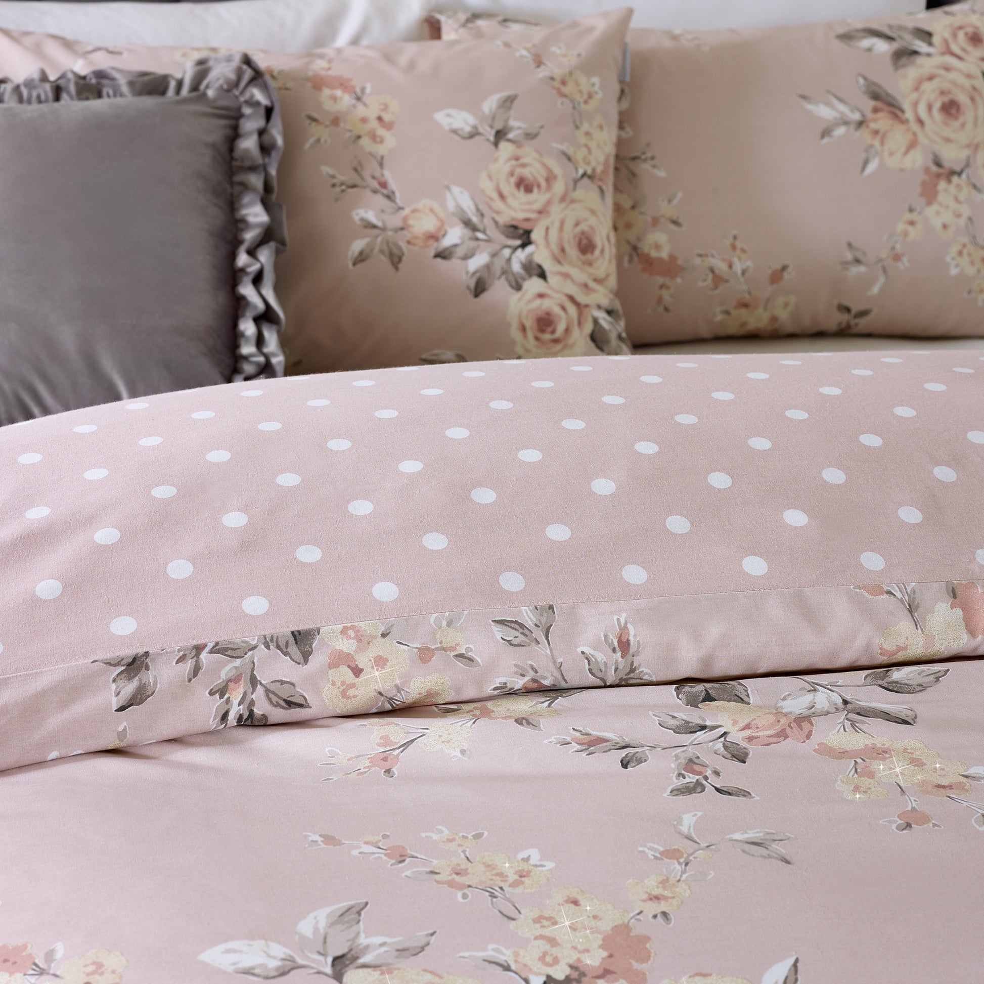 The Catherine Lansfield Canterbury Blush is a classical floral design of large bouquets with a polka dot reverse.