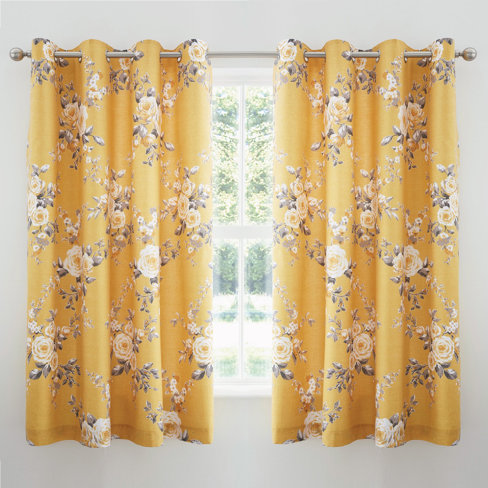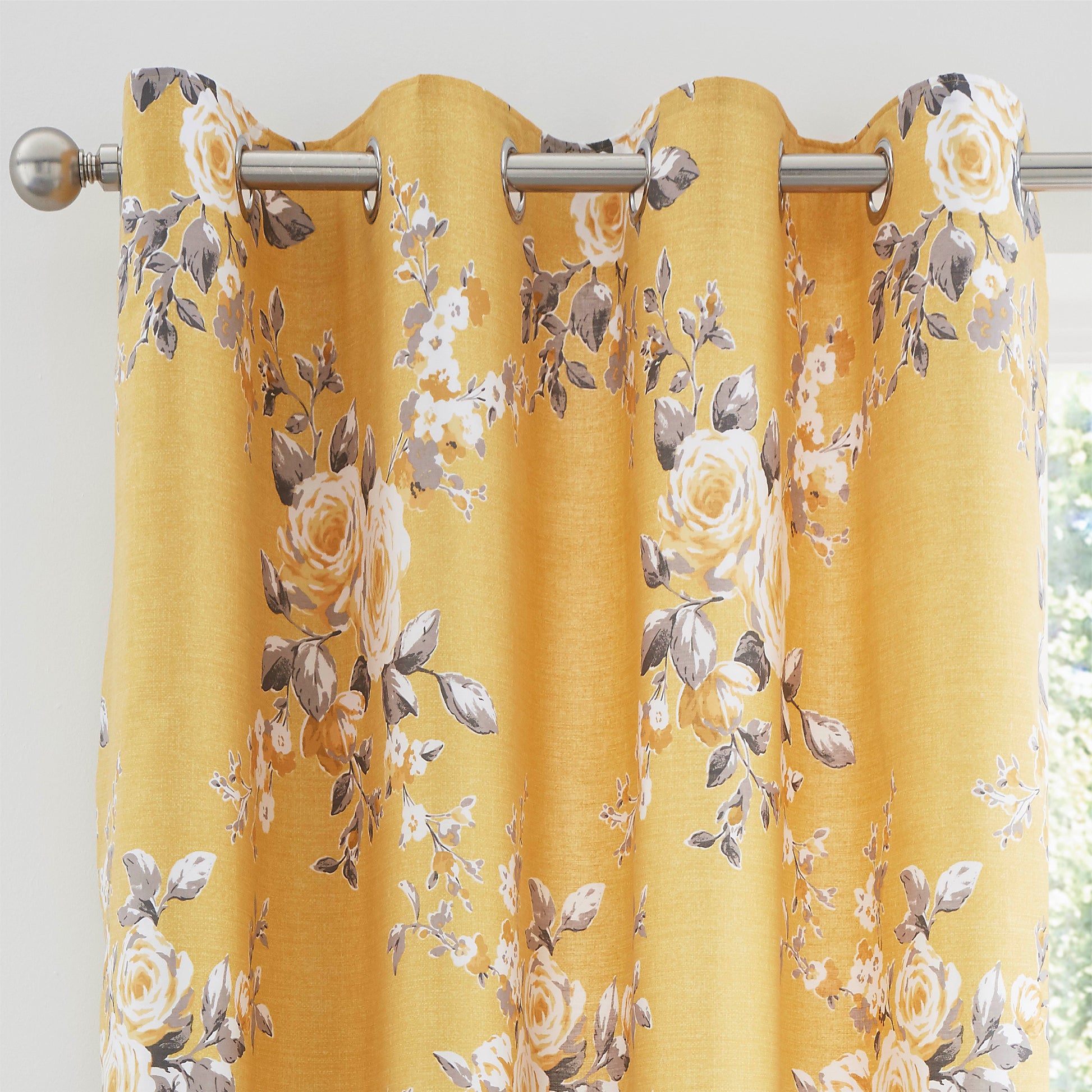 The Catherine Lansfield Canterbury Ochre eyelet curtains feature a classical floral design of large bouquets.