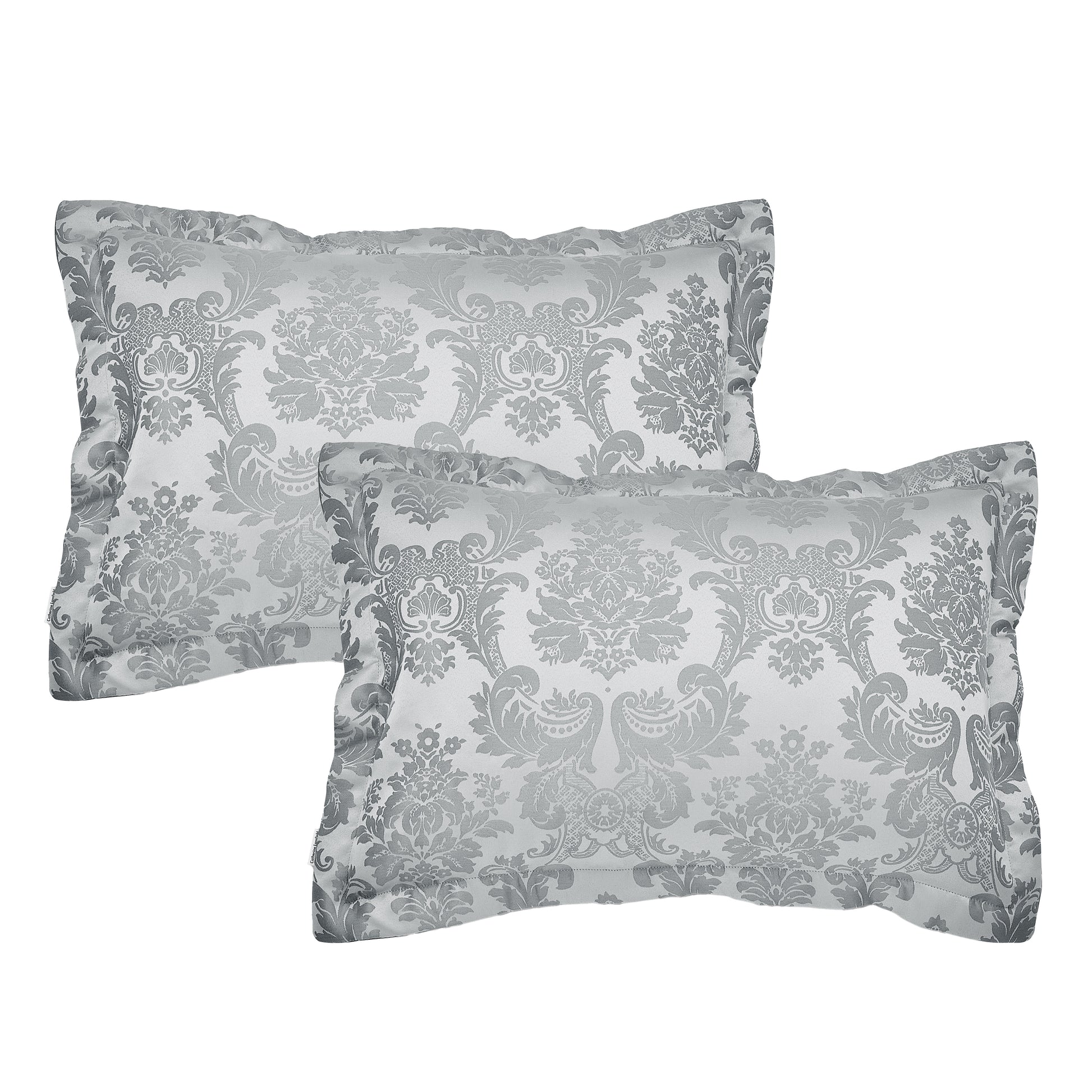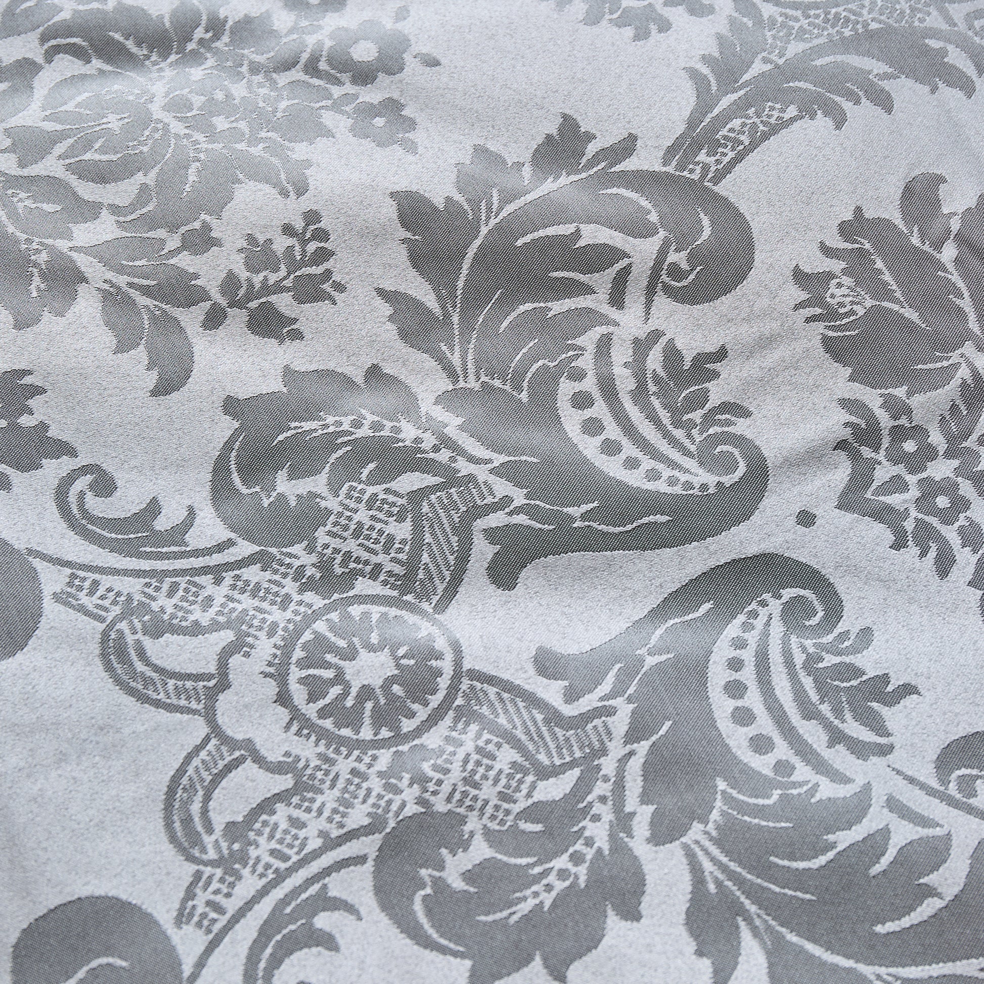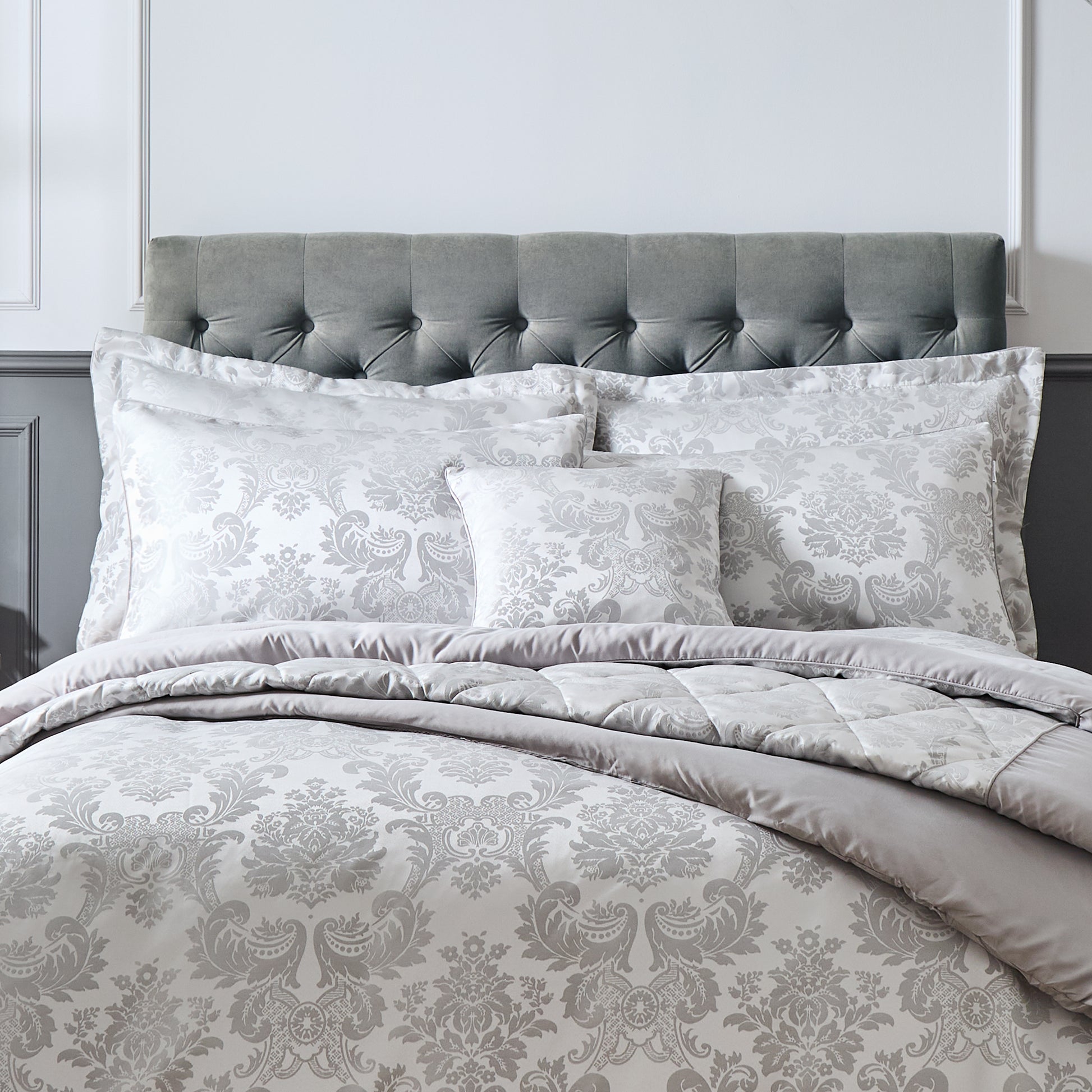 A beautiful and classic damask jacquard, woven with intricate scrolling leaf details in luxurious silver tones is perfect for a master bedroom with finishing touch accessories.