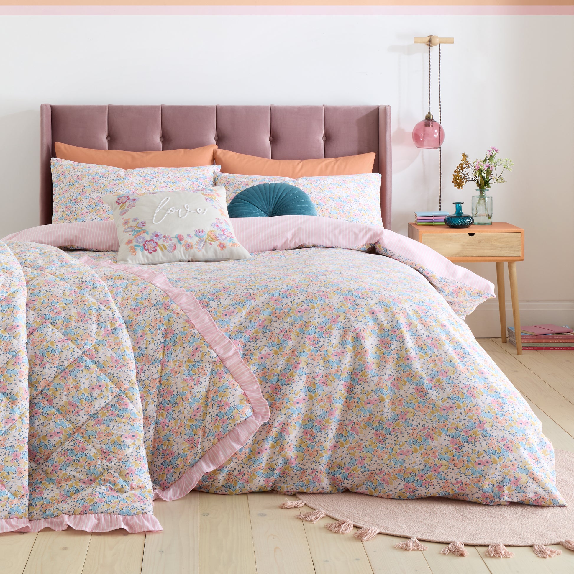The Catherine Lansfield Darcy Floral features a vibrant floral pattern that adds a burst of colour to any bedroom.