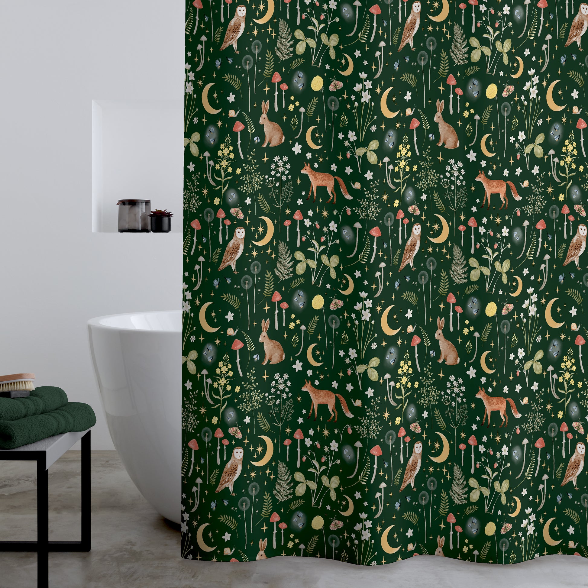 Create wonder and enchantment in your bathroom with this folklore inspired curtain, featuring illustrations of the fox, the owl and rabbits.