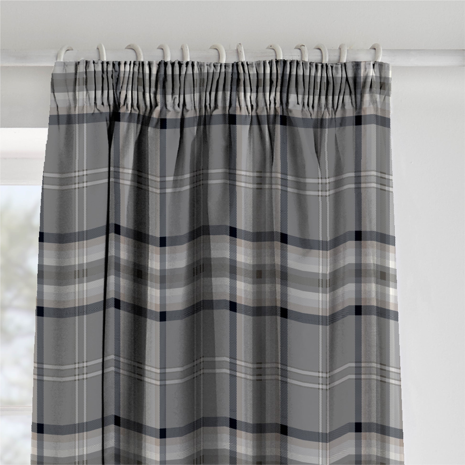 The Catherine Lansfield Kelso Charcoal Pencil Pleat Curtains combine charcoal, natural and white in a check pattern, creating a cosy feel.