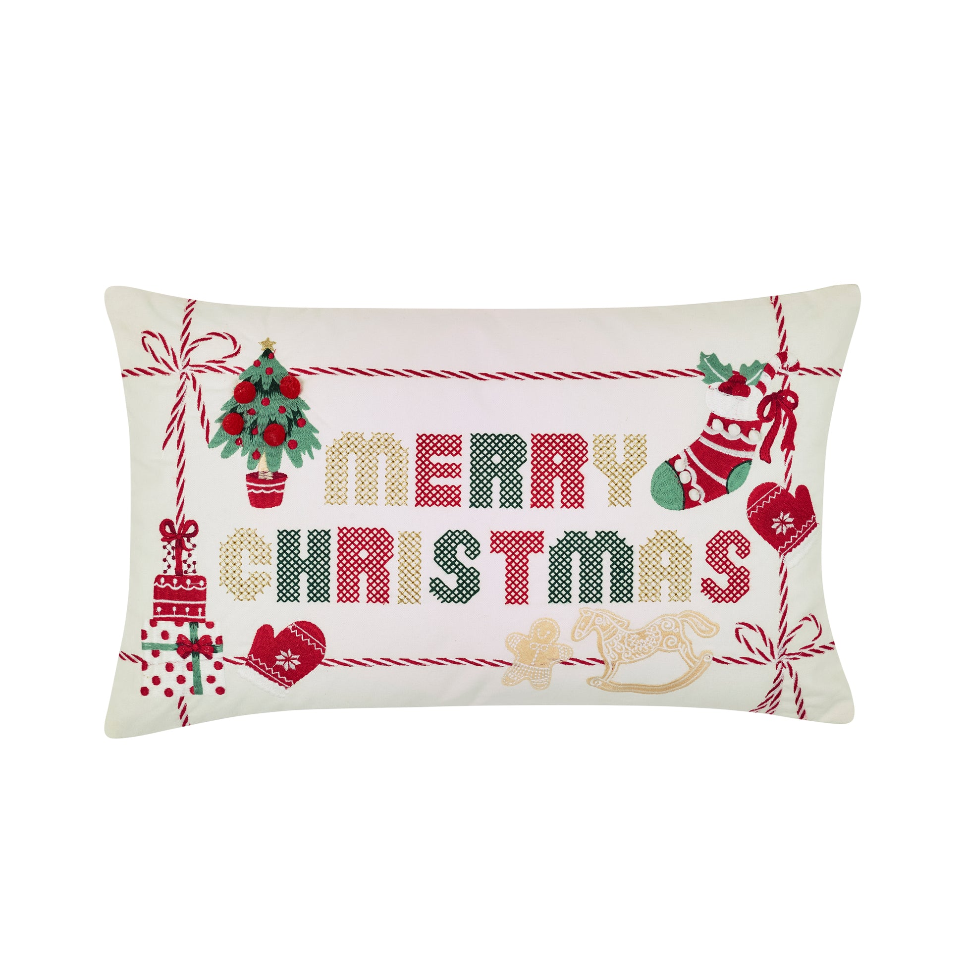 Add a touch of festive charm to your home with this beautifully crafted cushion, featuring delightful embroidered details that showcase classic Christmas elements, all framing the phrase ‘Merry Christmas’.
