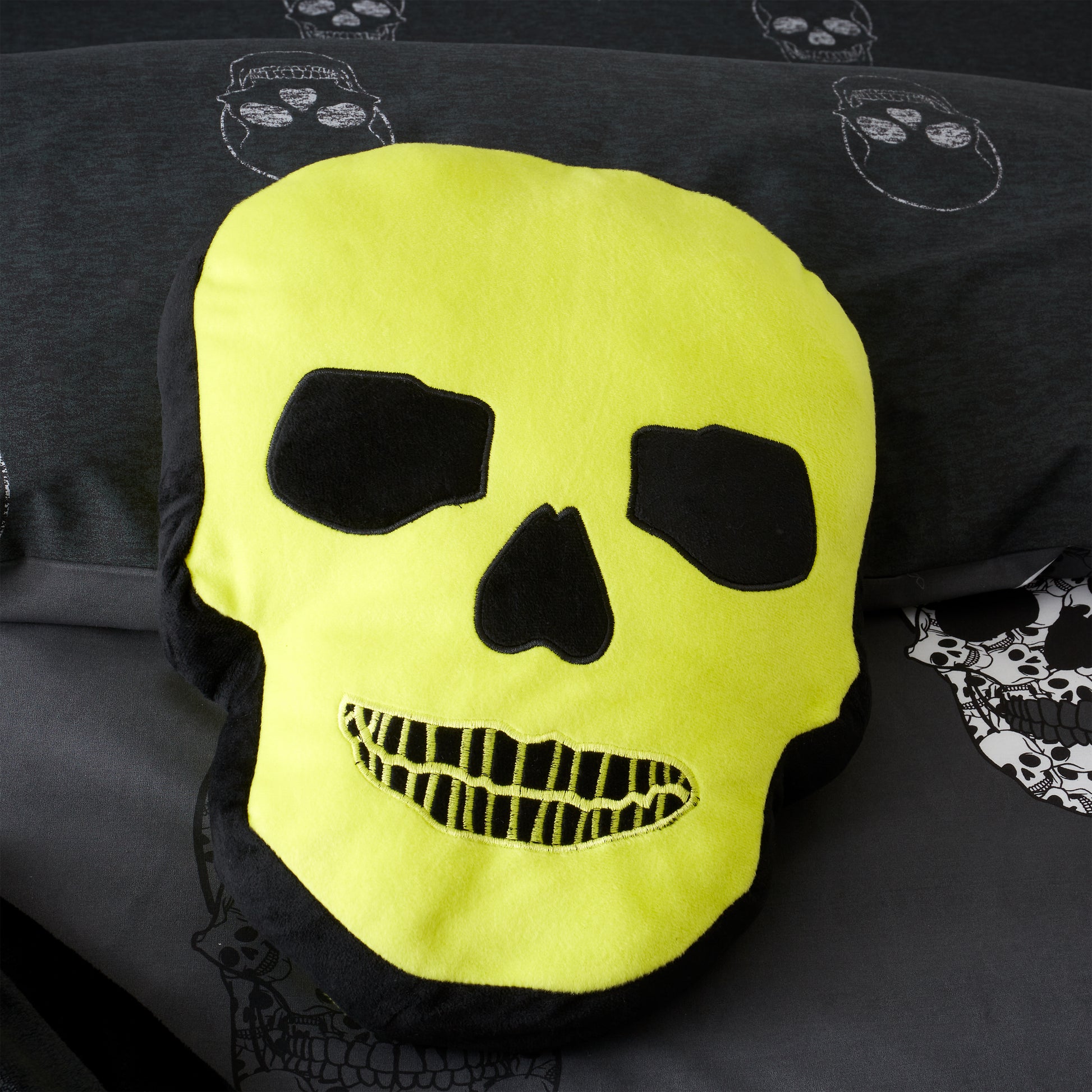 Snuggle up with this bright neon green 3D skull cushion.