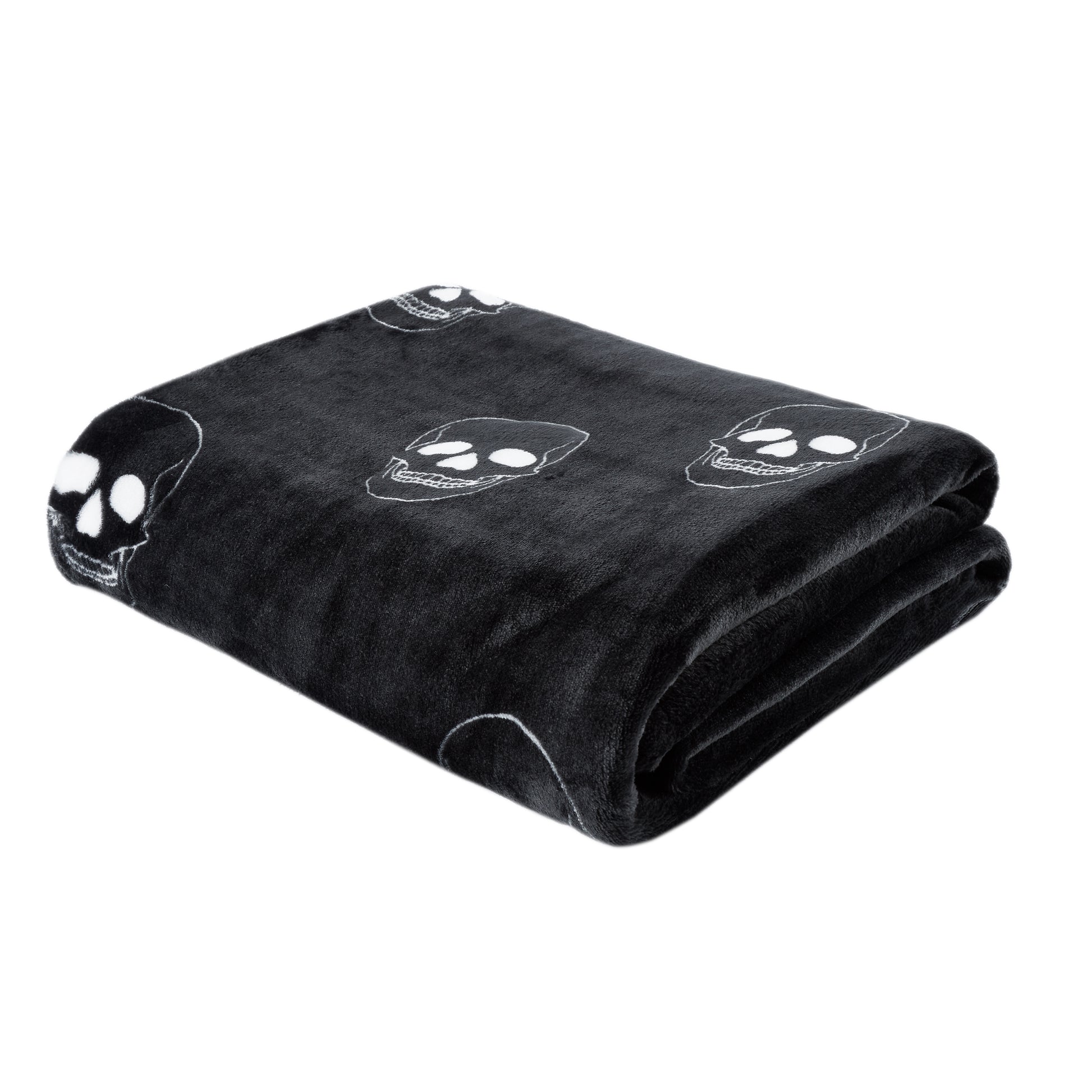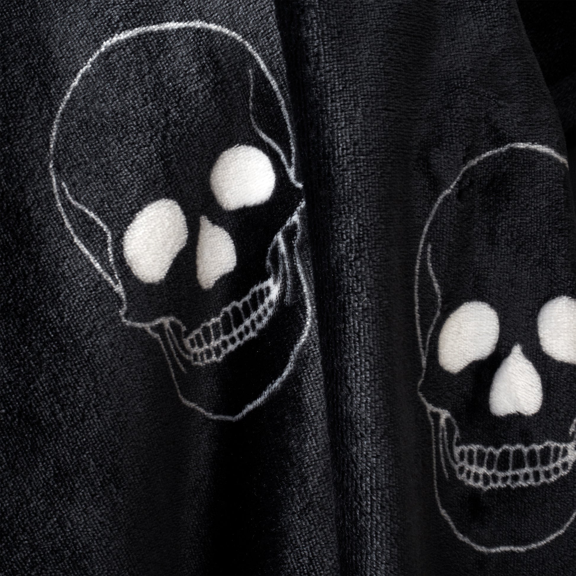 A repeating skulls pattern creates a striking design on a dark grey backdrop on super soft fleece.