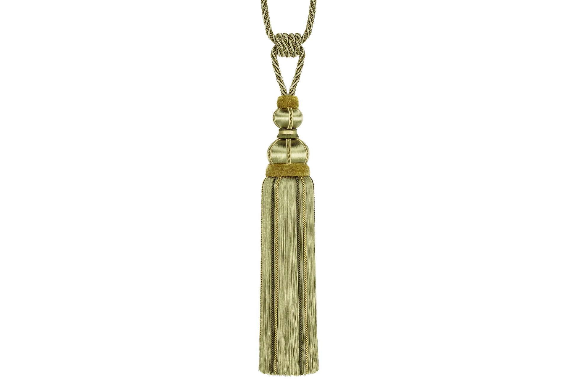 The Hallis Antoinette in Olive is a delicately luxurious single tasselled tieback with classical inspirations.