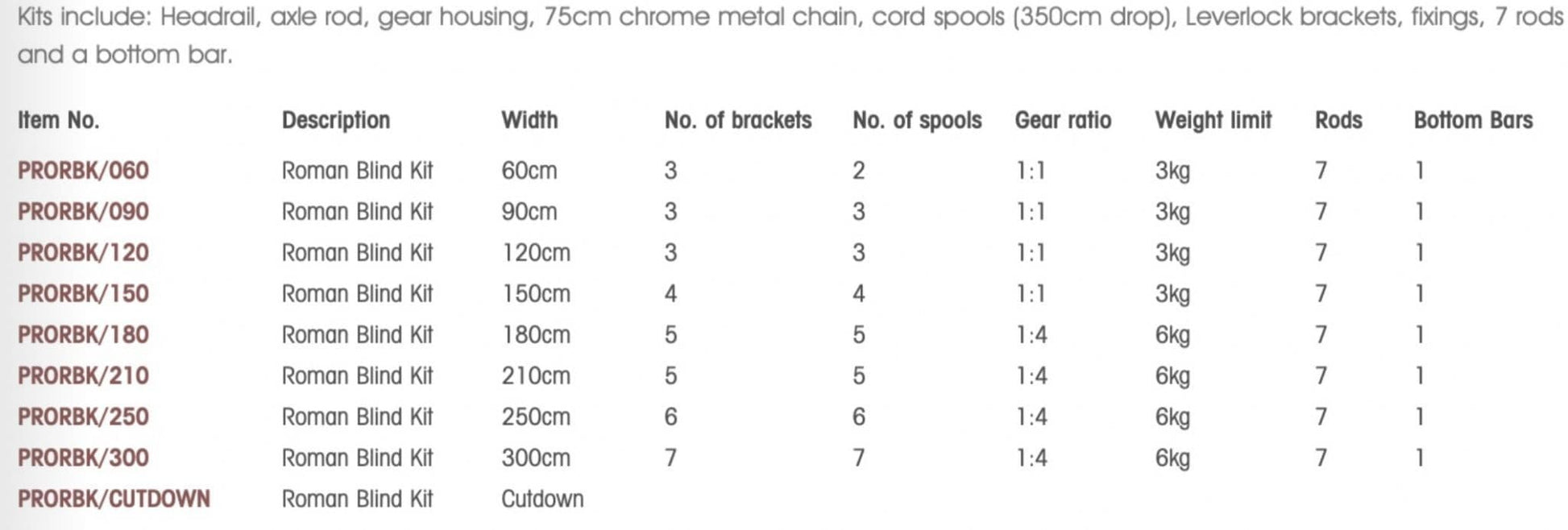 The Hallis Professional Metal Roman Blind Kit is available in 8 sizes.