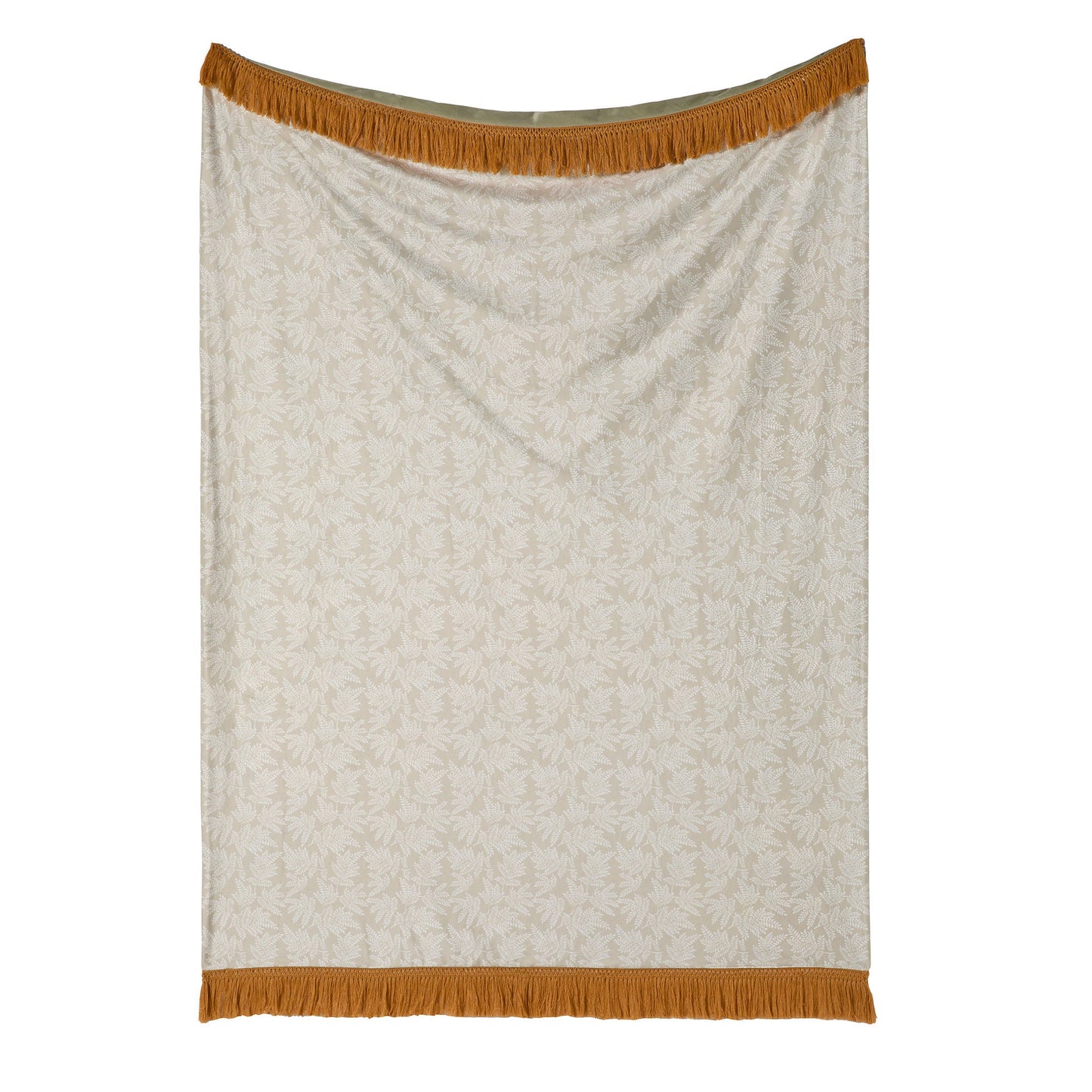 Immerse yourself in an opulent display of garden birds and foliage, masterfully captured in trend-setting soft gold and greens upon the caress of luxuriously soft velvet. Turn to the reverse, where a natural leaf print dances with abandon, punctuated by tantalizing tassels at both ends.