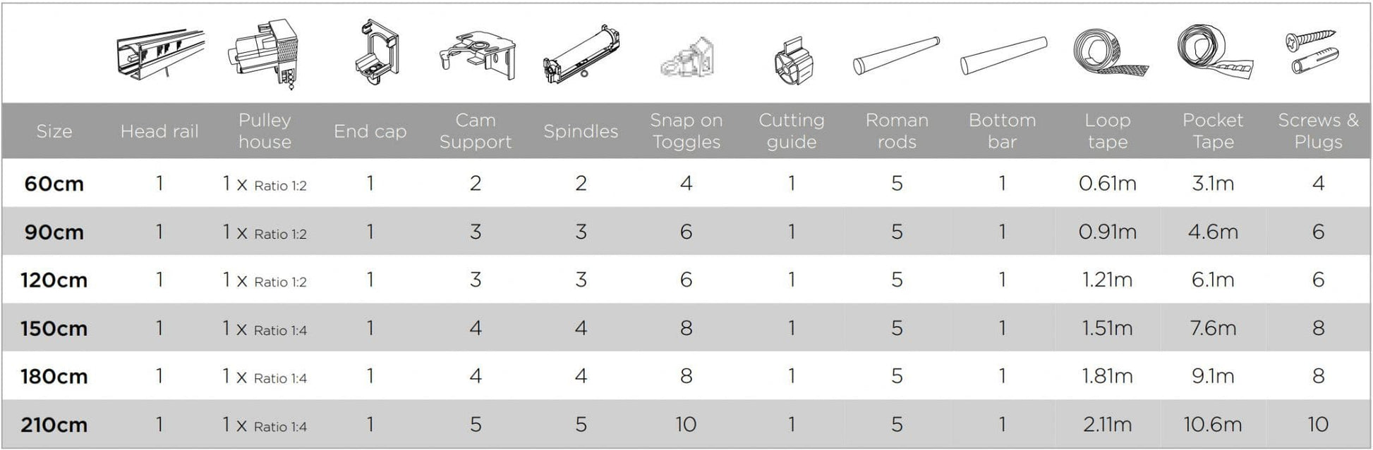 The Speedy Connect Cassette Aluminium Roman Blind Kit is available in 6 sizes.
