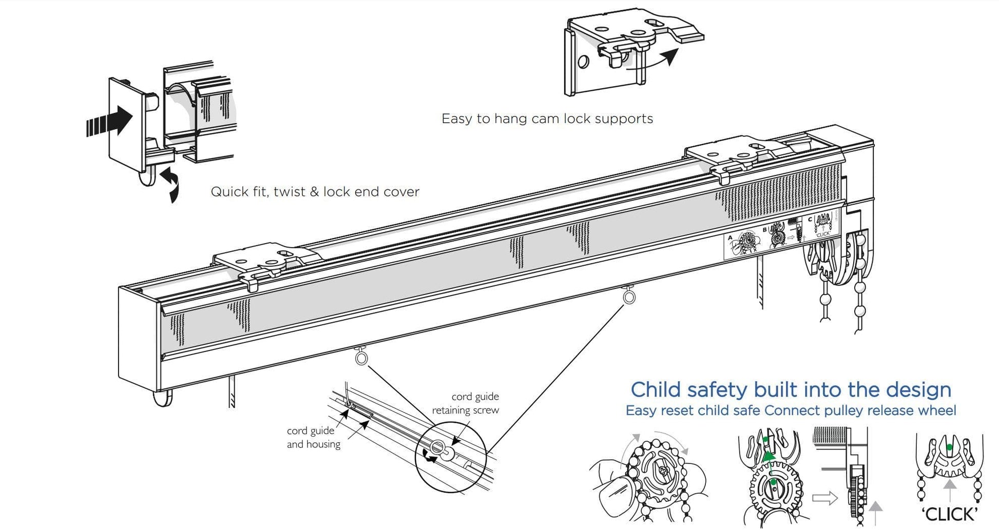 Cam lock supports - Mounting your headrail is quick and simple with these supports.